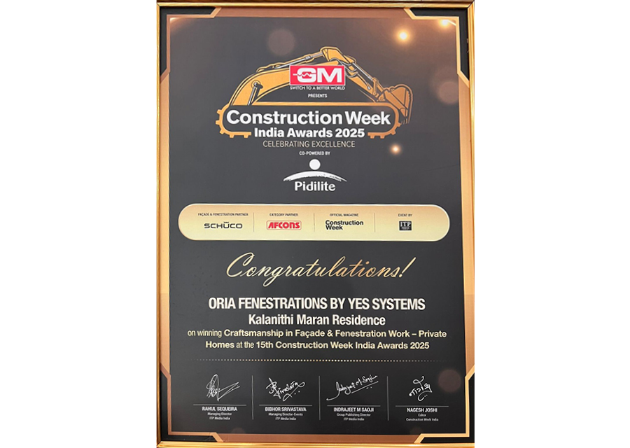 ORIA is honored to have received the prestigious Construction Week India Award for Craftsmanship in the Facade and Fenestrations category 2025