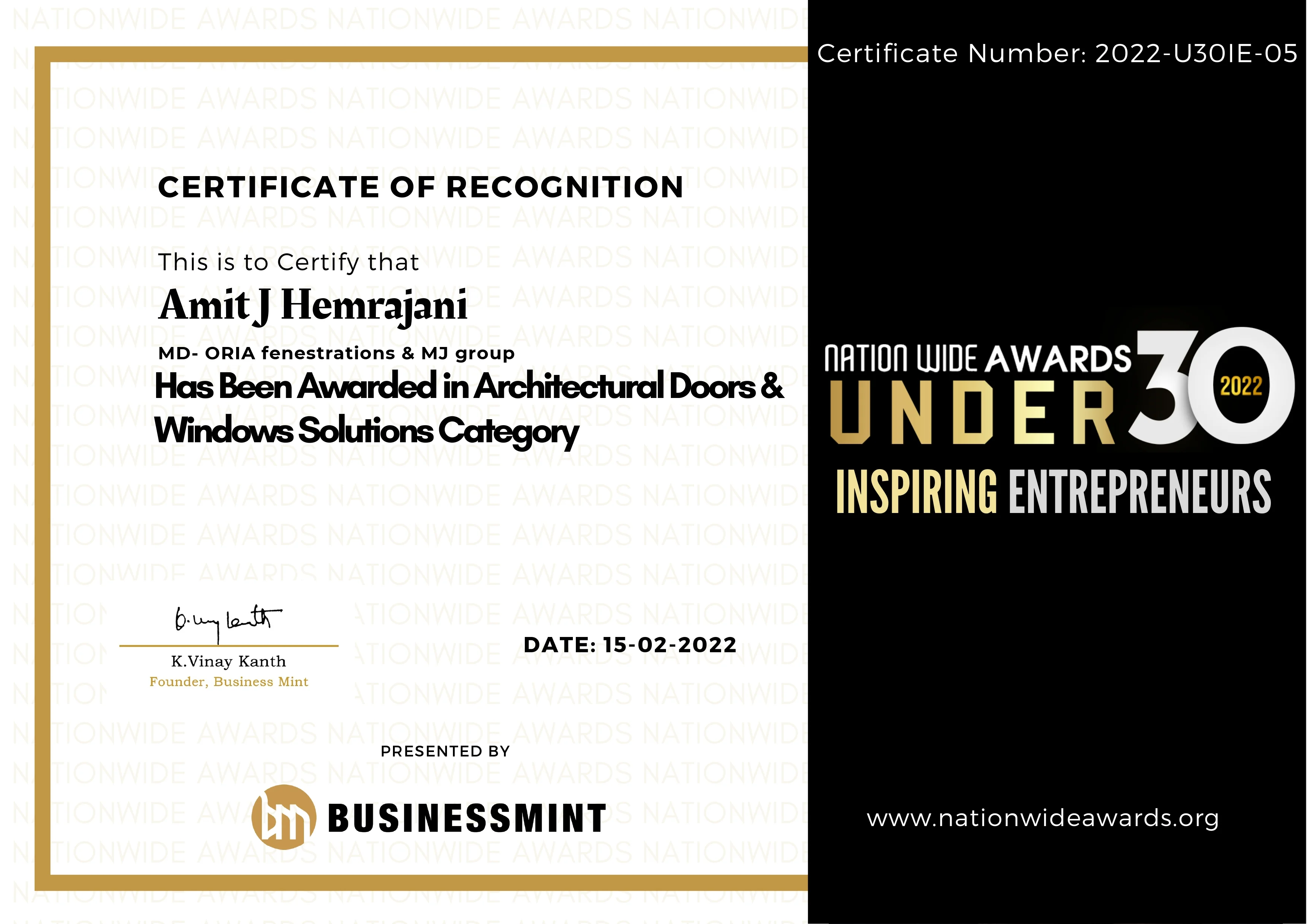 Know MoreORIA is proud to celebrate the recognition of our Managing Director, Amit J Hemrajani, who was honored with the Nationwide Award in the Architectural Doors & Windows Solutions Category by Business Mint. This award highlights his leadership, vision, and commitment to innovation, setting new benchmarks in the fenestration and building solutions industry.