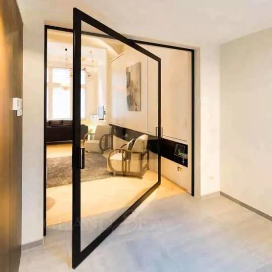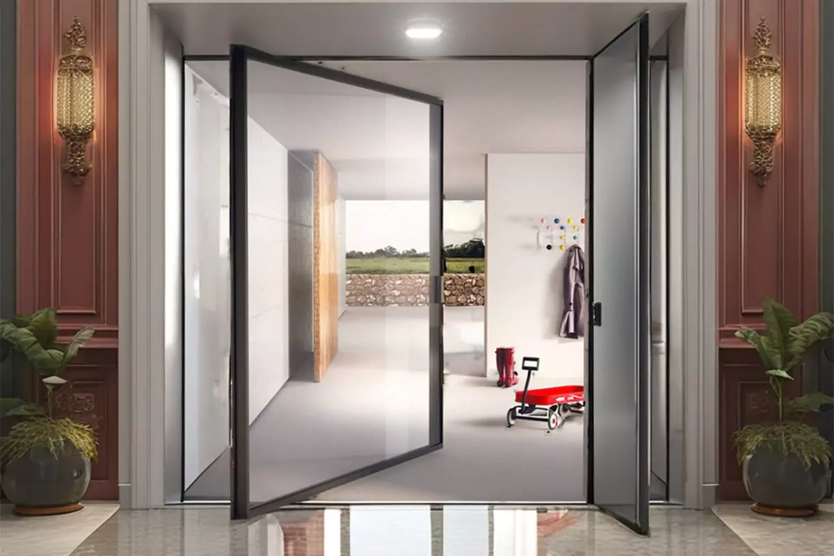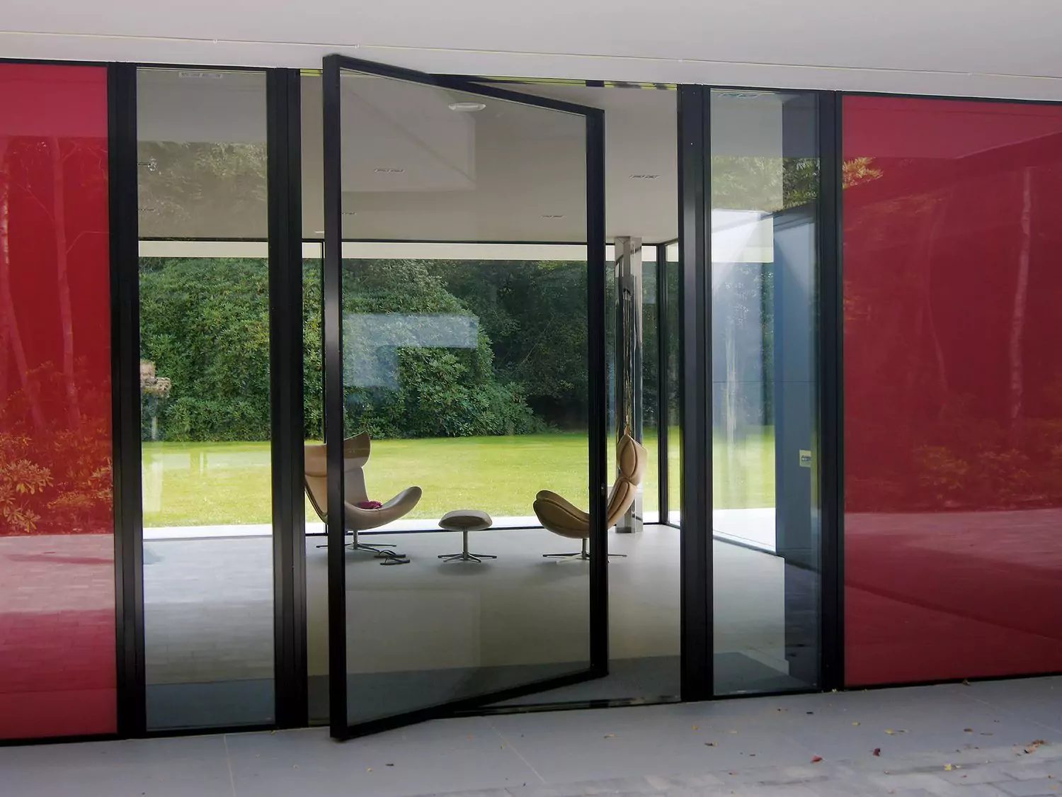 A sleek and modern architectural feature that emphasizes simplicity, clean lines, and functional elegance. Our minimalist pivot system gives full creative freedom: opt for a single glass pivot door or enhance the entrance with fixed glazed panels or corner elements. Choose between a central pivot or an off-centre pivot (also called eccentric pivot), depending on the architectural intent.